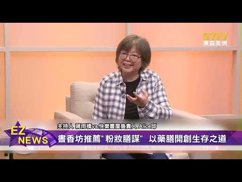 〈書香坊〉單元,「快樂書屋」 Alice邱、推薦穿越古代小說,"粉妝膳謀",看書中女主角運用藥膳,在宮廷權謀與生活困境中突圍成功。