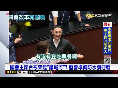 你要衝我就擋程序沒什麼好講,此時此刻攻佔主席台擋住後門才是最重要的事,國民黨民眾黨齊心協力,拉起繩子架起椅子擋住主席台後門,要嚴防敵營入侵也得隔起護城河,畢竟不少人上周被潑了一身,於是藍營準備了防水膜為韓國瑜架起屏障,但偶爾也會被耍了一下。民進黨立委李坤城:「測試一下,測試一下你們有沒有準備啊,有沒有在吃早餐啊。」