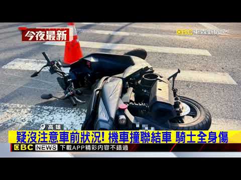 高雄一名騎士沒有注意車前狀況,騎車時車子往左偏,不甚擦撞到一旁的聯結車,騎士當場摔車,肋骨骨折,手腳也有多處擦挫傷。